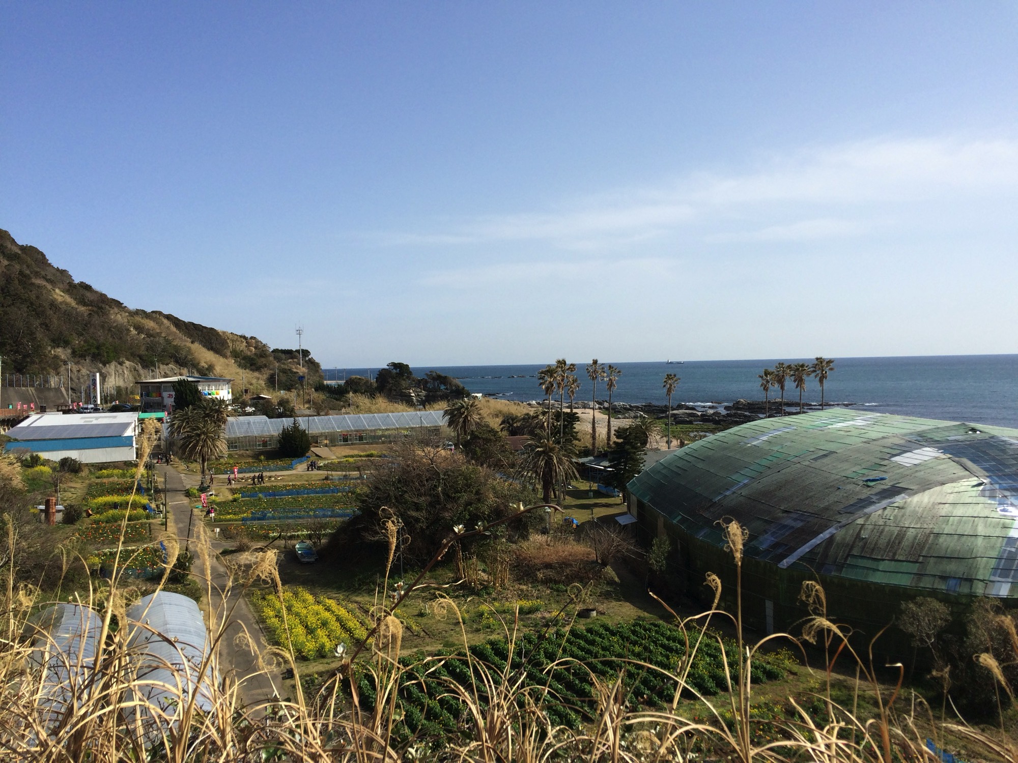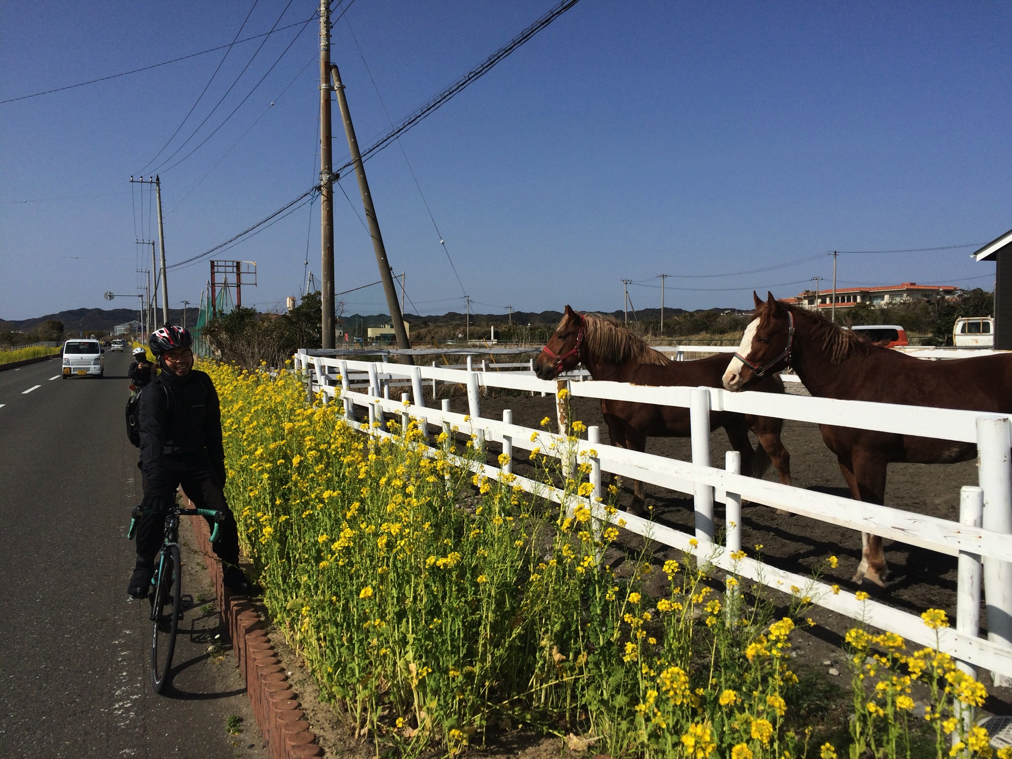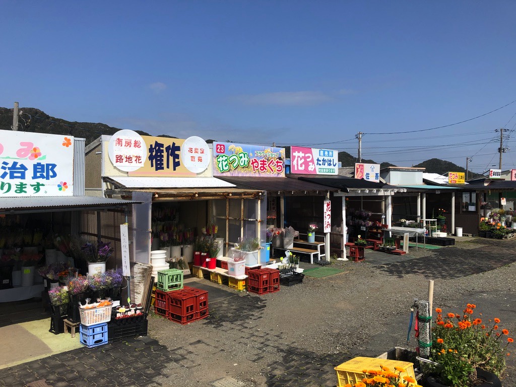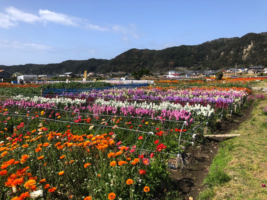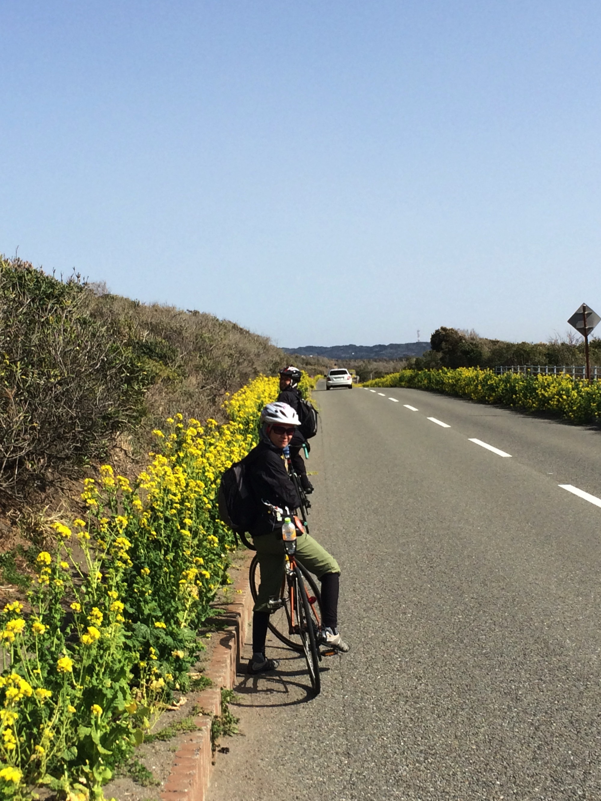 The Boso Peninsula makes up most of Chiba Prefecture. The Boso Flowerline is 20 km of road which runs along the coast of the southern tip of the peninsula. This area has a milder climate than the rest of Kanto making it a good place to ride during colder weather. It’s also conducive to raising flowers. The city of Chikura has large flower fields next to the road. There are also plots of flowers lining the road and fields of yellow canola flowers.