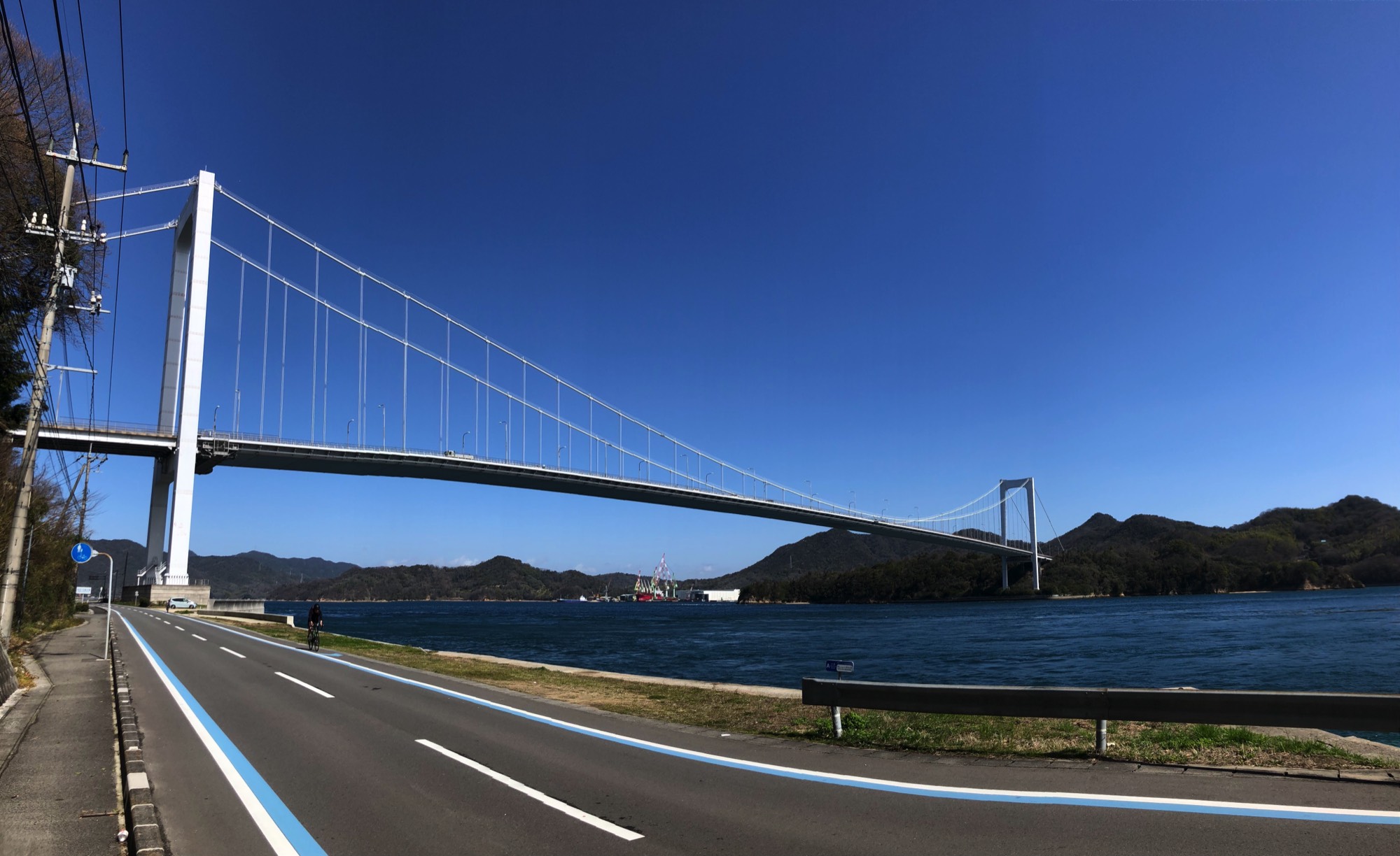 The Shimanami Kaido is a road running from Onomichi, Hiroshima Prefecture to Imabari, Ehime Prefecture connecting 6 of the islands in the Seto Inland Sea. Of the 3 land connections between the main island of Honshu and Shikoku, it is the only route traversable by bicycle. It was designed with cyclists in mind having designated cycling trails for much of the route and well-designed ramps spiraling up to the bridges.